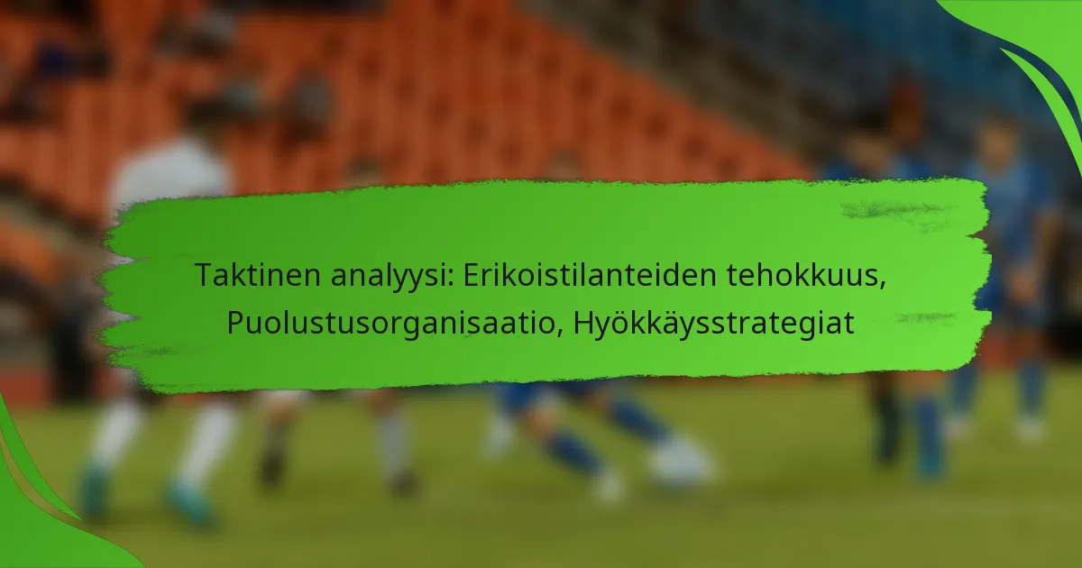 Jalkapallon taktinen analyysi kattaa kolme keskeistä osa-aluetta: erikoistilanteiden tehokkuus, puolustuksen organisointi ja hyökkäysstrategiat. Erikoistilanteet tarjoavat arvokkaita mahdollisuuksia maalintekoon, kun taas puolustuksen organisointi keskittyy maalien estämiseen rakenteellisten muodostelmien ja viestinnän avulla. Samaan aikaan tehokkaat hyökkäysstrategiat sisältävät koordinoituja liikkeitä ja innovatiivisia taktiikoita, joilla hyödynnetään vastustajien heikkouksia ja luodaan maalintekopaikkoja.